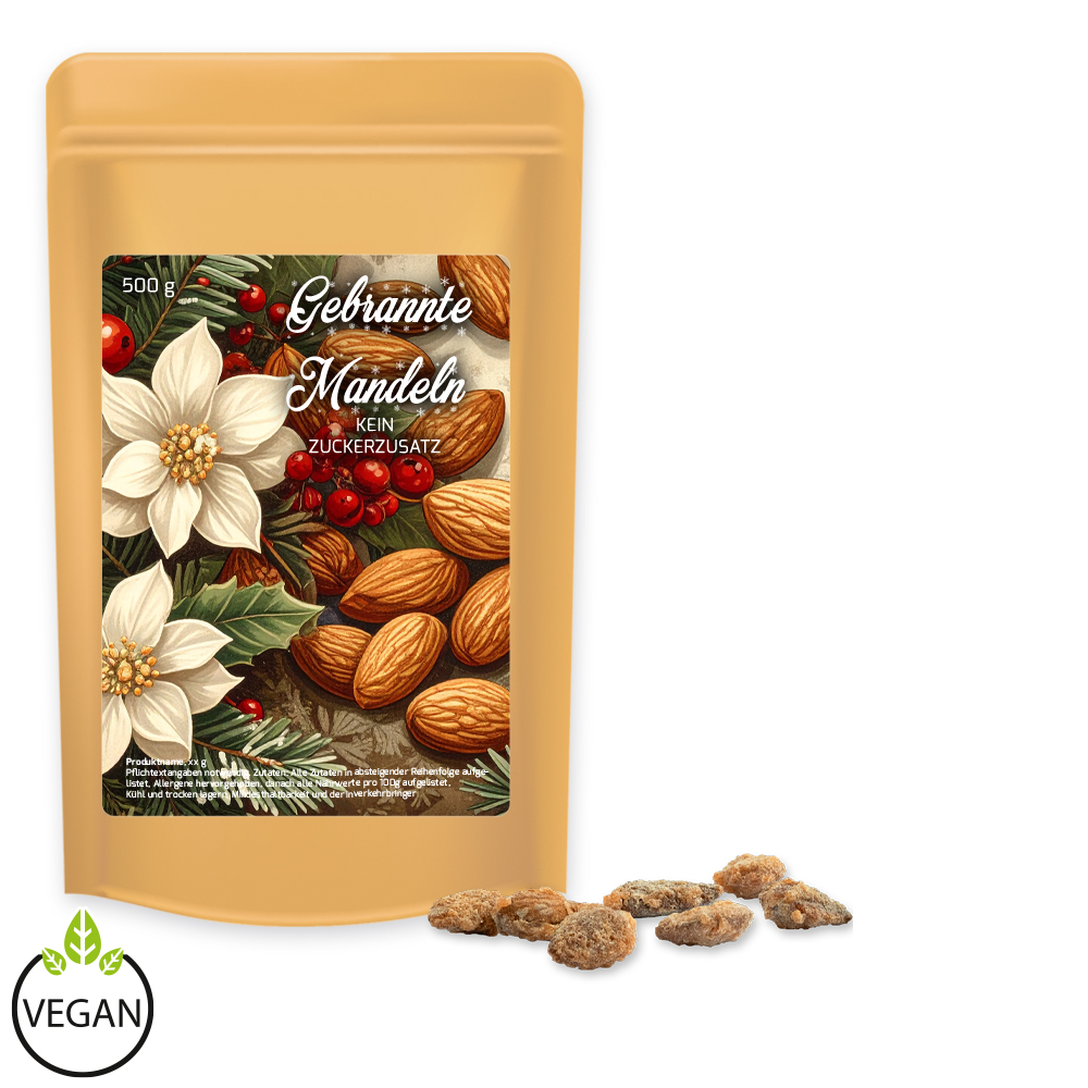 Süsser Genuss – ganz ohne Zuckerzusatz! Unsere gebrannten Mandeln werden traditionell hergestellt, kommen aber ganz ohne Industriezucker aus. Mit Erythritol gesüsst, bleiben sie wunderbar knackig und aromatisch – für echten Weihnachtsmarktgeschmack ohne Reue. Die feine Mischung aus Vanille, Kakao und Zimt sorgt für ein unwiderstehliches Aroma und weihnachtliche Wärme. Ein besonderes Giveaway für Kunden, Partner oder Mitarbeitende, das Genuss und Bewusstsein perfekt vereint – natürlich süss, ganz ohne schlechtes Gewissen.